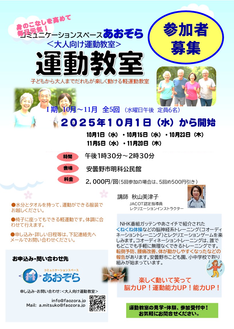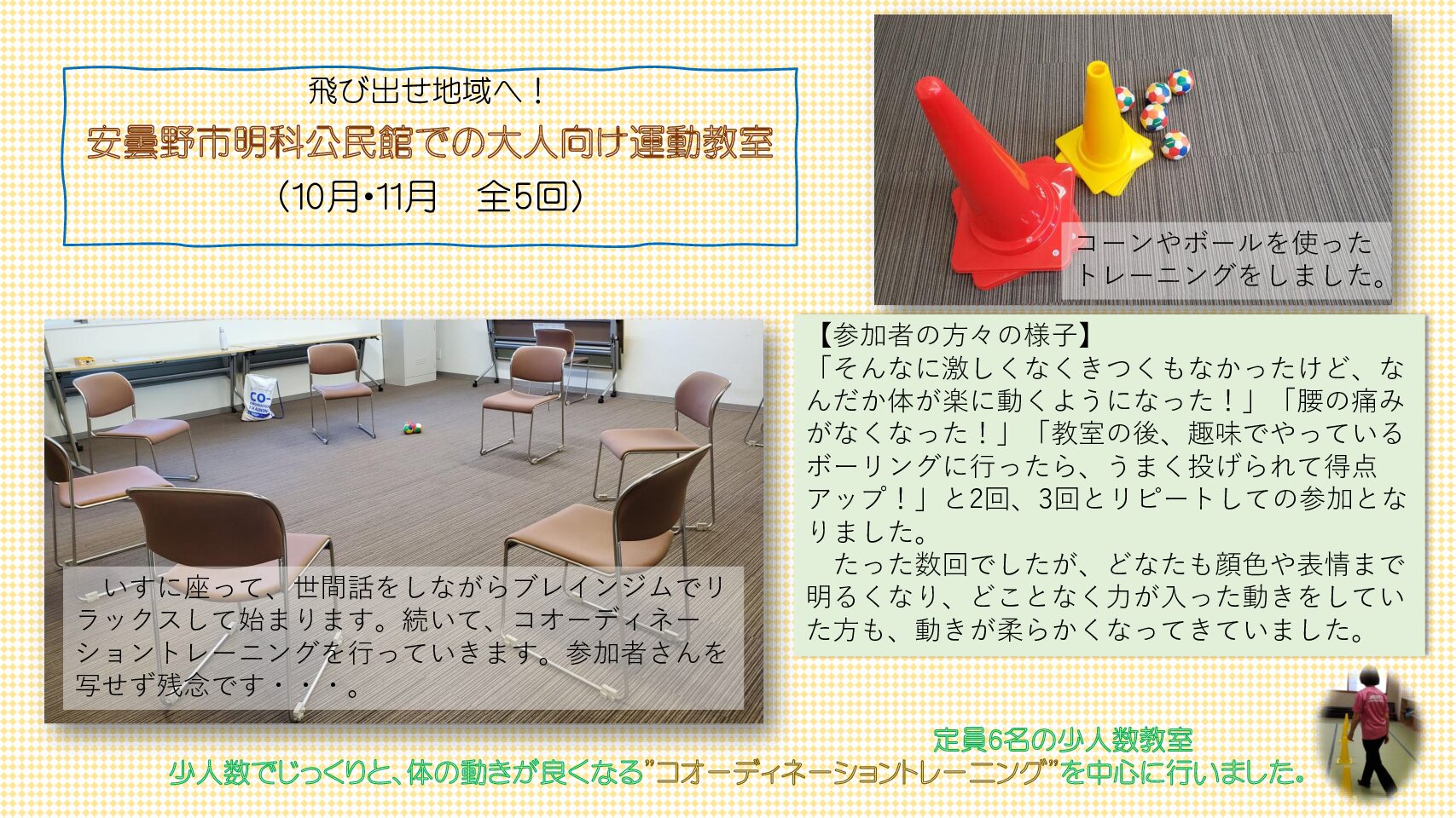 2025.11.25 コラム 飛び出せ地域へ!10月11月運動教室より 2025.11.25 お知らせ 12月の予定 2025.10.24 11月の予定 2025.10.01 コラム 明科公民館運動教室始まりました。 2025.09.27 お知らせ 10月の予定 2025.09.14 お知らせ 【お知らせ】大人向け運動教室始まります。