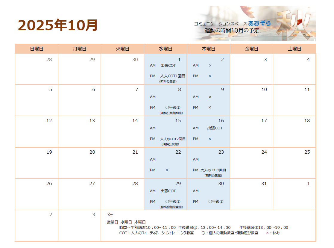 学生から高齢者まで《大人向け運動教室》 身のこなしを高める運動『コオーディネーショントレーニング』を中心にレッスンしていきます。 子供から大人まで《運動遊びの教室》 身のこなしを高める運動『コオーディネーショントレーニング』と、脳の働きを促す『統合遊びⓇ』や『ブレインジム』で楽しくレッスンしていきます。 団体様向け《出張教室》 学校、親子地域活動、PTA、公民館活動、その他活動へ出張し、体力・身のこなしの向上やけがの予防、転倒予防等、体づくりのためのトレーニングを行います。